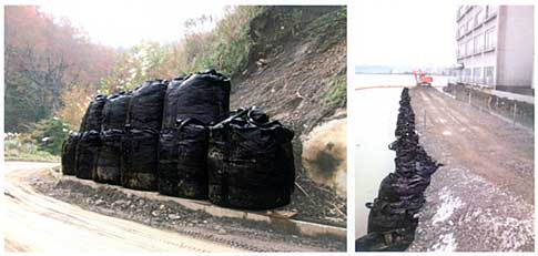 生地が丈夫で、形状安定性がよく、作業がしやすい大型土のうです。中詰め材が投入しやすいように、紐などで投入開口部を容易に保持できます。